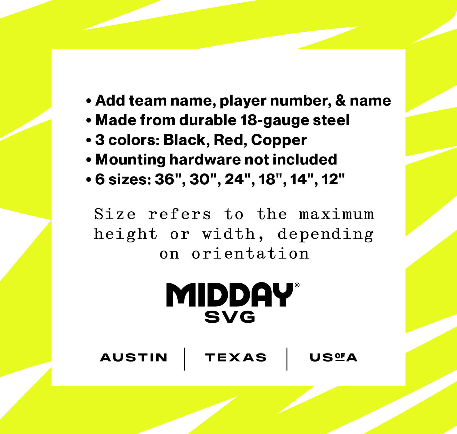 • 6 Sizes - 36", 30", 24", 18", 14", 12" *Selected size is based on the maximum height or width of the sign depending on physical orientation